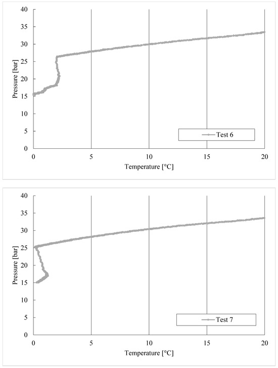 Such different behaviours can also be deduced from the P-T trend associated with these tests, described in Figure 6. The process started with intensity only after the system had already reached the minimum temperature. In addition to this, these experiments also obtained the lowest pressures reached during the whole series of experiments, and corresponded to the tests with the most abundant production of hydrates.