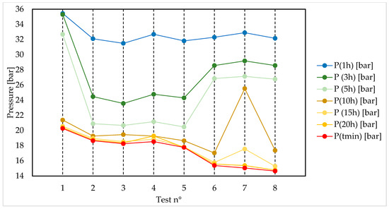 In the last experiments, the trend seemed to reverse itself: in Test 6 and Test 8, the most relevant pressure variation happened between 5 and 10 h, while in Test 7, the same occurred between 10 and 15 h.