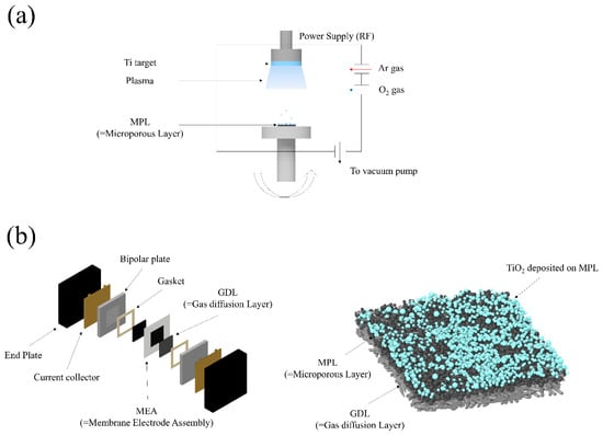 Therefore, novel modifications, such as hydrophilic material coatings or nanostructured surface engineering, are required to enhance water retention and improve PEMFC performance under dry operating conditions. Studies on the MEA have actively centered on enhancing the performance of the electrolyte membrane and catalyst layer, playing a crucial role in optimizing PEMFC performance [25]. The bipolar plate is a key component in PEMFCs, responsible for controlling the flow of gases and water. Traditionally, research has focused on improving water removal performance and gas transport efficiency through flow field designs [26]. In particular, enhancing the surface properties of the bipolar plate and optimizing flow field structures have significantly contributed to improved water management and performance stability [27]. Recently, complementing traditional studies, the GDL and MPL have gained attention for their critical roles in regulating the pathways of water and gas transport to enhance water management. Research aimed at improving the physical and chemical properties of the GDL and MPL complements studies on MEAs and bipolar plates, emerging as a new approach to stabilize PEMFC performance under low-humidity conditions. To enhance water management, various hydrophilic materials such as SiO2 and TiO2 have been explored, with TiO2 proving particularly effective due to its superior water adsorption capability and chemical stability [28,29,30,31,32]. Oxygen vacancies within the crystalline structure of TiO2 play a crucial role in adsorbing water molecules on its surface [33,34] These vacancies influence the electronic structure of TiO2, enhancing its ability to attract electrons. Such defects create spaces where electrons can move freely in oxygen-deficient regions, promoting interactions with surrounding electrons [35,36]. As a result, TiO2 enhances electrochemical activity and plays a crucial role in the moisture management of PEMFCs by adsorbing water molecules on its surface. Specifically, oxygen vacancies facilitate the bonding with water molecules, helping to supply sufficient moisture to the electrolyte membrane of PEMFCs [37]. These materials have been applied to PEMFC components through deposition techniques such as Atomic Layer Deposition (ALD), sputtering, and sol–gel methods [38,39,40,41]. Among these, sputtering is particularly advantageous due to its high deposition rate, uniform thin-film formation, and room-temperature process compatibility [42,43]. In this study, the sputtering process was utilized to deposit TiO2 (titanium dioxide) onto the microporous layer (MPL) to mitigate performance degradation in PEMFCs under low-humidity conditions [30,44]. The structural and electrochemical properties of the sputtered TiO2 layers were analyzed, and their impact on PEMFC performance was evaluated [36,37,45,46]. The PTFE (polytetrafluoroethylene) incorporated into the MPL plays a critical role in maintaining uniform moisture distribution within the electrolyte membrane of PEMFCs [24,45]. The combination of TiO2 and PTFE enhances the structural properties of the MPL, effectively improving its moisture adsorption and distribution capabilities [36,45]. This study demonstrated that the oxygen vacancies in TiO2 facilitate water adsorption in PEMFCs, enabling stable performance even under low-humidity conditions [33,47]. These findings are expected to contribute to the advancement of PEMFC technology by providing a more efficient and durable approach to water management [33,47].