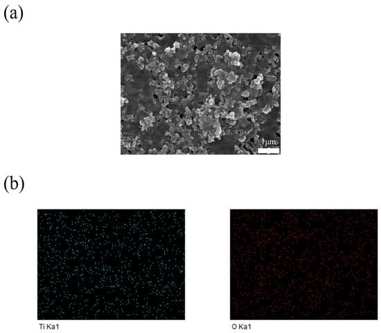 SEM-EDS mapping results of TiO2 deposited MPL. (a) SEM image, (b) Ti distribution (left), and O distribution (right).
