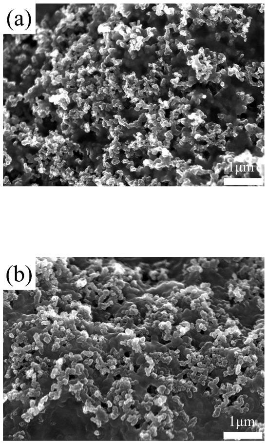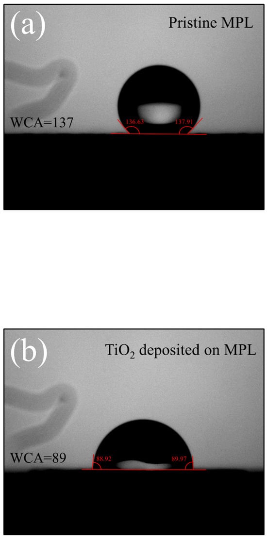 TiO2 inherently possesses hydrophilic properties and contains oxygen vacancies [50]. These oxygen vacancies have a tendency to attract water molecules or retain free electrons on the surface or within the vacancies, contributing to the prevention of membrane dehydration and the enhancement of electronic conductivity [34,35]. First, the chemical composition of the TiO2-deposited MPL was analyzed using SEM-EDS. The results of the SEM-EDS analysis are presented in Table 1 and Figure 2. As shown in Table 1, the atomic percentage of Ti:O was measured as 1:1.2. This indicates that the TiO2 thin film has a relative deficiency of oxygen, suggesting the presence of numerous oxygen vacancies within the TiO2 film [51,52,53]. Figure 2 shows the distribution of Ti and O on the GDL surface analyzed through EDS mapping. The SEM image in Figure 2a illustrates the surface distribution of Ti and O particles on the MPL, revealing their uniform dispersion. This uniformity confirms the effectiveness of the sputtering process in achieving consistent and controlled deposition. Figure 3 presents the pristine GDL (MPL side) and the GDL with TiO2 deposited on the MPL side. The average pore size on the MPL side of a commercial GDL is approximately 7.0 µm, with a porosity of about 75–80%. In Figure 3a, it can be observed that the pristine GDL surface contains pores with diameters on the micrometer scale. These relatively large pores negatively affect the formation of thin films when using the sputtering process. The porosity and roughness of the substrate are widely known to hinder the formation of thin films during the sputtering process [54,55]. As shown in Figure 3b, although TiO2 was deposited onto the MPL, pores are still observed on the surface. The thickness of the TiO2 layer was controlled to be 30 nm, as calibrated using a Si wafer substrate. However, as shown in Figure 3a, the MPL, with micrometer-scale pores much larger than the nanometer-scale thin films, fails to form a uniform thin film. As shown in Figure 3b, TiO2 islands are not clearly visible on the rough surface of the MPL. This is likely because TiO2 exists in the form of nanoparticles, making it difficult to distinguish using SEM due to its nanometer-scale dimensions. To verify the presence of the sputter TiO2 on MPL, water contact analysis was conducted. Figure 4 presents the water contact angle measurement results for pristine MPL (a) and TiO2-deposited MPL (b). The contact angle of the pristine MPL was measured to be approximately 137°, indicating a hydrophobic surface. This high contact angle is attributed to the presence of PTFE (polytetrafluoroethylene) in the MPL of the PEMFC. PTFE facilitates water removal from the surface, enhancing the water management performance within the PEMFC [24]. In contrast, the TiO2-deposited MPL exhibited a significantly reduced contact angle of 89°, indicating a transition to a hydrophilic surface. The approximately 48° reduction in contact angle is primarily due to the intrinsic hydrophilicity of TiO2. Furthermore, the presence of oxygen vacancies further enhances this hydrophilicity by promoting water adsorption on the surface [48,50]. Oxygen vacancies play a critical role in the adsorption and retention of water molecules, thereby enhancing surface wettability [35]. By the water contact angle analysis, the hydrophilicity of the MPL was modified by adopting sputter TiO2. The pristine MPL facilitates water removal due to its hydrophobic nature, this characteristics can be detrimental in maintaining membrane hydration in dry environments [30]. In contrast, the TiO2-coated MPL exhibits a significantly reduced contact angle, strengthening moisture retention and supporting stable hydration. The inherent hydrophilicity of TiO2, along with its oxygen vacancies, promotes water adsorption and distribution, effectively preventing membrane dehydration under low-humidity conditions. These results highlight the potential of TiO2 to improve the overall performance and durability of PEMFCs, particularly under low-humidity conditions.