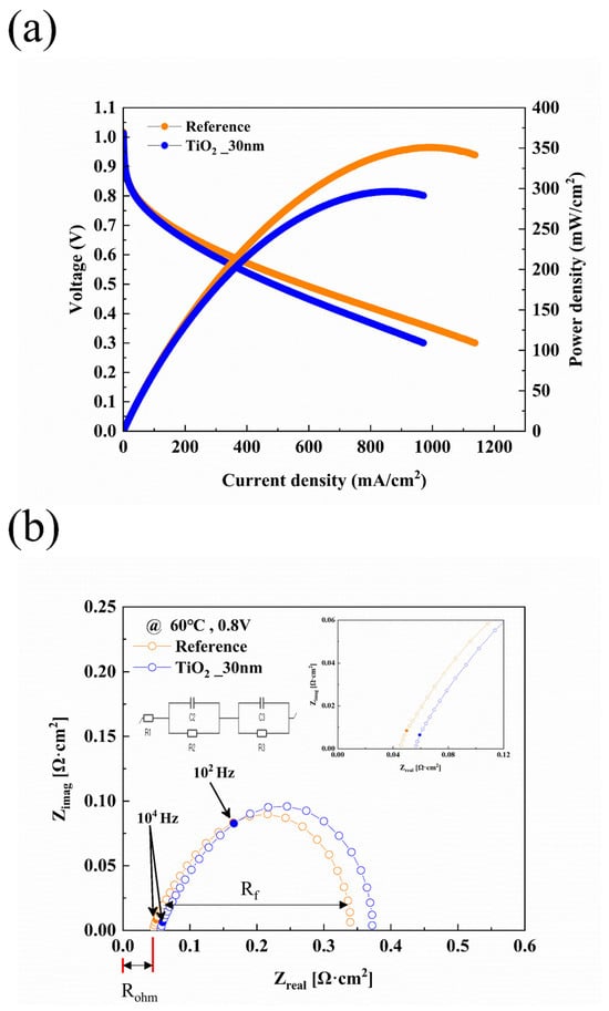 Figure 5 illustrates the initial electrochemical performance of the PEMFC before the long-term stability test. Before measuring its performance, the PEMFC underwent an activation process. As previously mentioned, the activation was conducted under fully humidified conditions (RH 100%). Subsequently, the humidity of the gases supplied to the anode and cathode was adjusted to RH 50% for performance evaluation. The electro-chemical performance of the fuel cell was evaluated under low-humidity conditions. Before the measurement, the PEMFC underwent an activation procedure under fully humidified conditions (RH 100%) to ensure sufficient membrane hydration and stabilize electrochemical reactions. The activation process involved operating the fuel cell under fully humidified conditions for a certain period until a stable performance was achieved. During this activation phase, the initial performance of the TiO2-coated MPL was lower than that of the uncoated MPL. This performance drop is attributed to the strong hydrophilicity of TiO2, which led to excessive water retention in the high-humidity environment, impeding gas diffusion and temporarily increasing mass transport resistance. However, once the PEMFC was transitioned to low-humidity conditions (RH 50%), the TiO2-coated GDL exhibited improved water retention, mitigating membrane dehydration and enhancing proton conductivity. These results align with previous studies indicating that hydrophilic surface modifications can lead to localized flooding under fully humidified conditions but provide significant advantages in maintaining water balance and stable performance under dry condition [56]. This dual behavior highlights the importance of optimizing TiO2 coating thickness and distribution to balance water retention and gas diffusion for long-term stability in PEMFC applications. Figure 5a shows the J-V-P curve when the gases supplied to the anode and cathode had a relative humidity (RH) of 50% after activation. Figure 5a shows the J-V-P curve when the gases supplied to the anode and cathode had a relative humidity (RH) of 50% after activation. The fuel cell with pristine MPL is referred to as the “Reference”, while the fuel cell with the TiO2-coated MPL is referred to as “TiO2_30 nm”. The performance of the reference fuel cell was 350.88 mW/cm2, whereas the initial performance of the TiO2_30 nm fuel cell was 294.66 mW/cm2, showing a 16.02% lower performance. The lower initial performance is attributed to the limited contribution of oxygen vacancies in TiO2 to the formation of electronic conduction pathways, which restricts electron transport. To further investigate this effect, EIS was performed to analyze changes in charge transport resistance and overall cell impedance. According to the studies by Pham et al. [35] and Sarkar et al. [52], oxygen vacancies can provide pathways for electron conduction; however, in the early stages, the number and distribution of oxygen vacancies might have been limited.