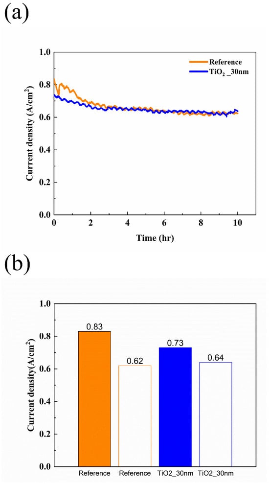 Figure 6 presents the results of the constant voltage experiment, with Figure 6a showing the measurements over 10 h and Figure 6b summarizing the results in a bar graph. After measuring the performance of the activated fuel cell, long-term stability was evaluated at 0.4 V for 10 h. The initial current density of the reference fuel cell with the bare MPL was measured to be 0.83 A/cm2. The current density of the reference fuel cell decreased from 0.83 A/cm2 to 0.62 A/cm2 after 10 h, representing a 25.3% reduction. In comparison, the TiO2_30 nm fuel cell exhibited a decrease in current density from 0.73 A/cm2 to 0.64 A/cm2, corresponding to a 12.33% reduction. Following the durability assessment under constant voltage conditions, the performance of the fuel cells was re-measured and analyzed. The results are summarized in Figure 7, which presents both J-V-P curves and Nyquist plots. As shown in Figure 7a, the maximum power density of the reference fuel cell decreased from 350.88 mW/cm2 to 254.46 mW/cm2 after the 10 h constant voltage test, corresponding to a 27.48% reduction. In contrast, the TiO2_30 nm fuel cell exhibited a smaller reduction in power density, decreasing from 296.46 mW/cm2 to 259.81 mW/cm2 (12.36% reduction). Similarly, as shown in Figure 7b, the EIS results at 0.8 V revealed that the reference fuel cell experienced a 21.74% increase in ohmic resistance and a 50.74% increase in faradaic resistance. In comparison, the TiO2_30 nm fuel cell exhibited a more moderate 10.34% increase in ohmic resistance and a 26.34% increase in faradaic resistance. These results suggest that the fuel cell with TiO2-coated MPL demonstrated enhanced long-term stability under constant voltage operation. The superior durability of the TiO2_30 nm fuel cell can be attributed to multiple factors. First, while the presence of TiO2 initially increased ohmic resistance due to its intrinsic insulating properties and limited electron conduction pathways [35,44,46], the formation of oxygen vacancies over time provided alternative electron transport pathways, stabilizing resistance and mitigating excessive performance losses [35,37,52]. According to Pham et al. [35], oxygen vacancies within TiO2 facilitate electron conduction, and these pathways tend to stabilize with prolonged operation. This aligns with the observation that TiO2-coated MPL exhibited a lower increase in ohmic and faradaic resistance compared to the reference fuel cell. Beyond electron conduction effects, water management improvements also played a critical role in enhancing durability. While TiO2 coatings improve water retention under low-humidity conditions, previous studies have shown that they may contribute to excessive water accumulation under high-humidity conditions, potentially leading to flooding and performance degradation. While the hydrophilic nature of TiO2 improves water retention in dry conditions, its impact on drainage efficiency under humid conditions remains a challenge. Studies have suggested that optimizing hydrophilic–hydrophobic balance within MPL structures can promote capillary-driven water transport, preventing both dehydration and excessive flooding. Optimizing water removal strategies in high-humidity environments is essential to avoid excessive flooding and maintain stable performance at high power densities. Some studies have reported that ultra-thin hydrophilic coatings like TiO2 can facilitate a more uniform water distribution, which may reduce localized flooding while maintaining membrane hydration [56,57]. However, additional investigations are required to validate this effect under high-humidity, high-current-density conditions. This dual effect suggests that the application of TiO2-coated MPLs should be optimized depending on the operating humidity conditions of the fuel cell. In particular, at high current densities, excessive water accumulation can severely hinder gas diffusion and accelerate performance degradation, making drainage control an essential factor for large-scale PEMFC commercialization. However, this study primarily focuses on the performance of TiO2 coatings under low-humidity conditions, where water retention is a critical challenge. Future research will investigate the behavior of TiO2-coated MPLs under high-humidity conditions to fully understand their impact on PEMFC water management and performance stability.