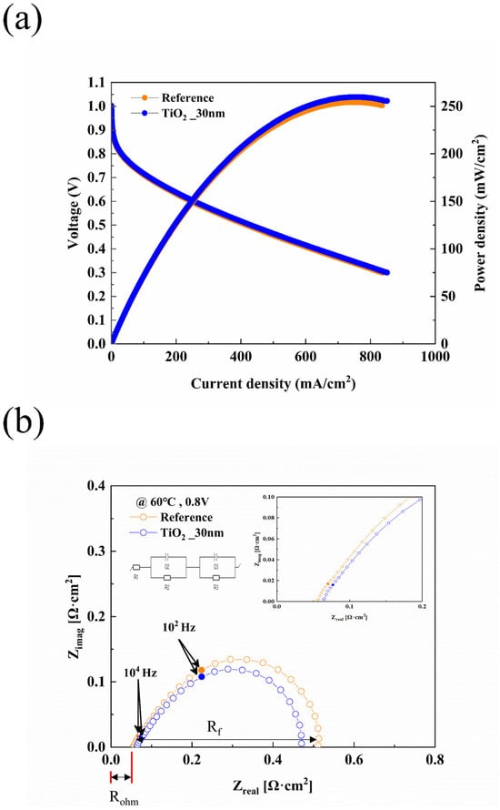 To evaluate the detailed behavior of the fuel cell, EIS measurements were conducted at 0.8 V, which is widely used in PEMFC studies for analyzing resistance components, particularly Faradaic resistance. The 0.8 V condition allows for a more accurate assessment of Faradaic resistance, which dominates the oxygen reduction reaction (ORR) kinetics in the cathode. Additionally, EIS data at 0.5 V is provided in the Supplementary Information for comparison (Figure S1), illustrating resistance variations at a lower operating voltage. The resistance in fuel cells is generally categorized into three types: faradaic resistance, ohmic resistance, and mass transport resistance. Ohmic resistance arises from ion transport through the electrolyte membrane and electrical conduction within the electrodes and bipolar plates. Faradaic resistance is associated with the electrochemical reactions occurring at the anode and cathode, particularly the sluggish oxygen reduction reaction (ORR) at the cathode. Mass transport resistance results from limitations in reactant gas diffusion and water management within the GDL and catalyst layer. Ohmic resistance can be identified from the Nyquist plot as the length from the origin to the intercept on the X-axis, which corresponds to the high-frequency region. Faradaic resistance is represented by the size of the semicircle drawn from the ohmic resistance on the Nyquist plot [1]. Figure 5b presents the EIS results of the fuel cells. The equivalent circuit model is also depicted in Figure 5b. As observed, the ohmic resistance and faradaic resistance of the TiO2_30 nm fuel cell are higher compared to those of the reference cell. At 0.8 V, the ohmic resistance and faradaic resistance of the reference cell were measured as 0.046 Ω·cm2 and 0.339 Ω·cm2, respectively. In contrast, the TiO2_30 nm fuel cell exhibited an ohmic resistance 0.058 Ω·cm2 (+26.09%) and a faradaic resistance of 0.372 Ω·cm2 (+9.73%). This increase is presumed to be due to the deposition of TiO2 on the MPL surface, which directly interacts with the catalyst layer. The increase in ohmic resistance and faradaic resistance after TiO2 deposition on the MPL is likely due to the insufficient formation of oxygen vacancies in the early stages, which limits electron transport. In the initial stages, the limited number and distribution of oxygen vacancies may result in inadequate conductive pathways, leading to increased ohmic and faradaic resistance.