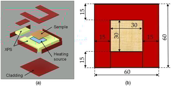 A square wooden specimen measuring 0.3 m × 0.3 m, with a thickness of 0.015 m, was enclosed within a thermally insulated box. The hand-made box was constructed by assembling 0.05 m thick XPS panels into a structure measuring 0.6 m in height and width, with a 0.1 m thickness. Wooden panels were glued to the XPS to enhance structural stability.