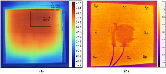 The heating mat used in [41] was here replaced by a square heat bed from Creality, a 3D printer manufacturer, as the heating element. This aluminum heat bed allows homogeneous and controlled heating from 0 °C to 130 °C, with 1 °C increments, regulated via a control unit. Figure 1 depicts the 3D view of the insulated box and its dimensions, already used in [41]. Figure 2 provides a comparison in terms of the homogeneous heating capacity of the sample, demonstrating the improvement made to the setup via the heat bed.