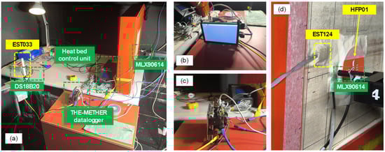 The experimental setup: overall view (a); the new datalogger (b,c); heat flux plate and surface and infrared surface temperature sensors (d). Yellow color is used for LSI and Hukseflux sensors; green color is used for the new measuring system.