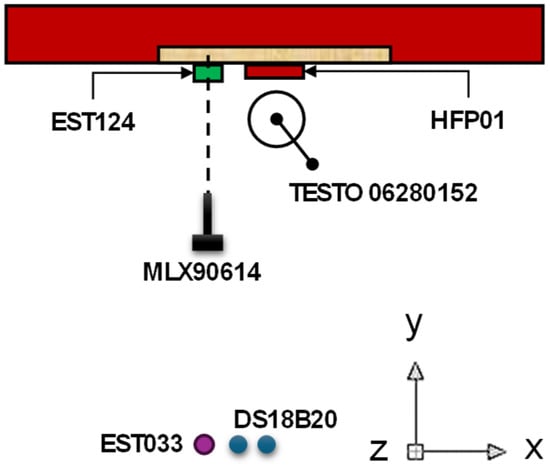 Additionally, a hot-wire anemometer TESTO 06280152 [45] was used to verify the air velocity data acquired by the Wind Sensor Rev. P near the sample. The schematic top view of the experimental setup is shown in Figure 4.