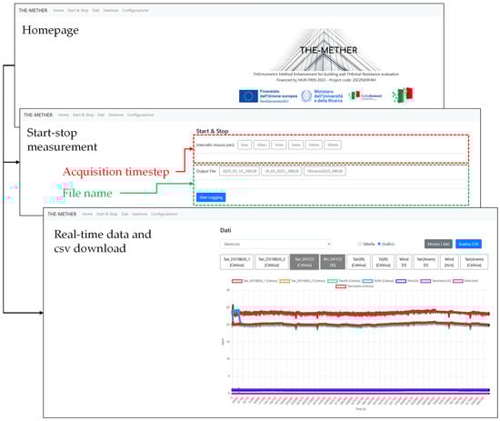 A web-based interface was developed for THE-METHER, enabling remote access via an IP address for measurement management, real-time data visualization, and data export. The interface includes a homepage, a measurement control panel for starting and stopping acquisitions, and configurable parameters such as acquisition timestep and file naming. A dedicated section allows users to monitor real-time data trends and download recorded measurements in CSV format for further analysis. This system enhances usability and accessibility, facilitating efficient data handling and visualization.