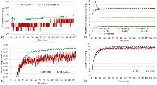 Heat transfer coefficients obtained from contact sensors and THE-METHER probes showed highly similar values (see Figure 6c). The convective coefficients were obtained by applying Equation (5), suitable for most engineering applications and capable of returning more accurate values. For the convective component, hc was 2.57 W/m2K using LSI sensors and 2.55 W/m2K with THE-METHER. The radiative coefficient was 5.14 W/m2K with LSI sensors and 5.13 W/m2K with THE-METHER. Consequently, the total heat transfer coefficients were nearly identical: 7.71 W/m2K from LSI sensors and 7.68 W/m2K from THE-METHER.