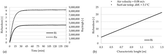 Richardson and Rayleigh trends obtained from the measurement campaign (a); influence of the characteristic length on Ri considering specific boundary conditions (b).