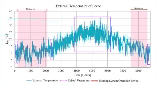 The school building under study is assumed to be located in the city of Lecce, in south-eastern Italy. Lecce has a Mediterranean climate with mild winters, warm springs, hot summers, and hot autumns, with annual precipitation under 500 mm. According to Köppen’s classification [29], Lecce is a warm-summer Mediterranean climate (Csa). Figure 1 illustrates the annual external temperature trend and marks the school vacation periods scheduled for 1–8 January, 6–8 April, 10 June–15 September, and 23–31 December. The days on which holidays begin and end may, of course, vary slightly over the years. The days presented here are indicative.