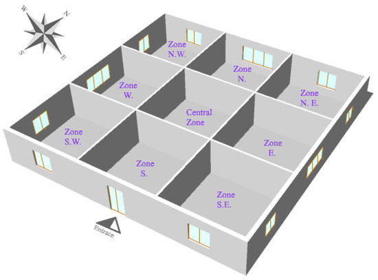 The building has a simple square plan with a net area of 332.70 m2, as illustrated in Figure 2. The area is divided into nine equal thermal zones, each measuring 6 × 6 m2, considered as classrooms. The school prototype model is straightforward. However, the selected geometric representation reflects typical classroom layouts, which are generally rectangular, with one or two exterior-facing walls featuring windows and at least one wall adjacent to a heated corridor or another internal thermal zone. The objective of this study is to analyze the thermal loads and comfort conditions within classrooms, which are characterized by high internal heat gains compared to other school areas. The simplification does not compromise the accuracy of the thermal analysis, as it retains the essential thermal interactions relevant to the study.