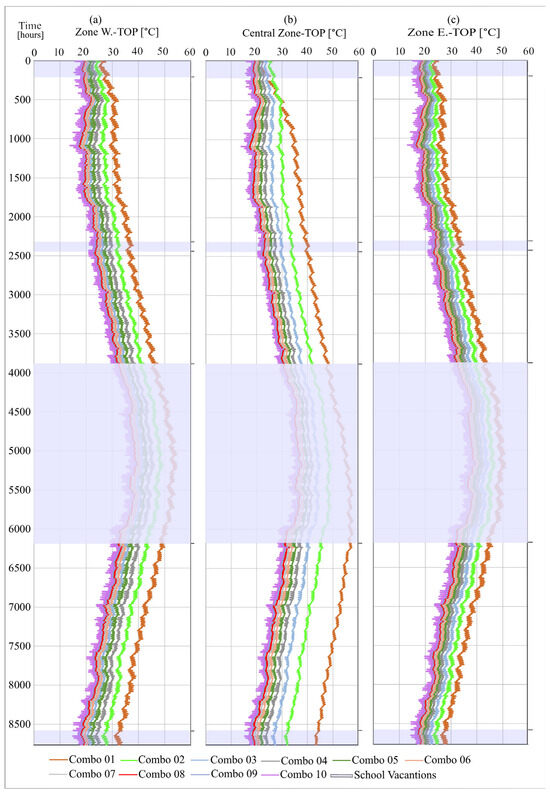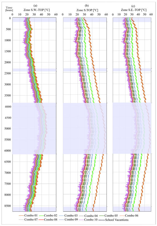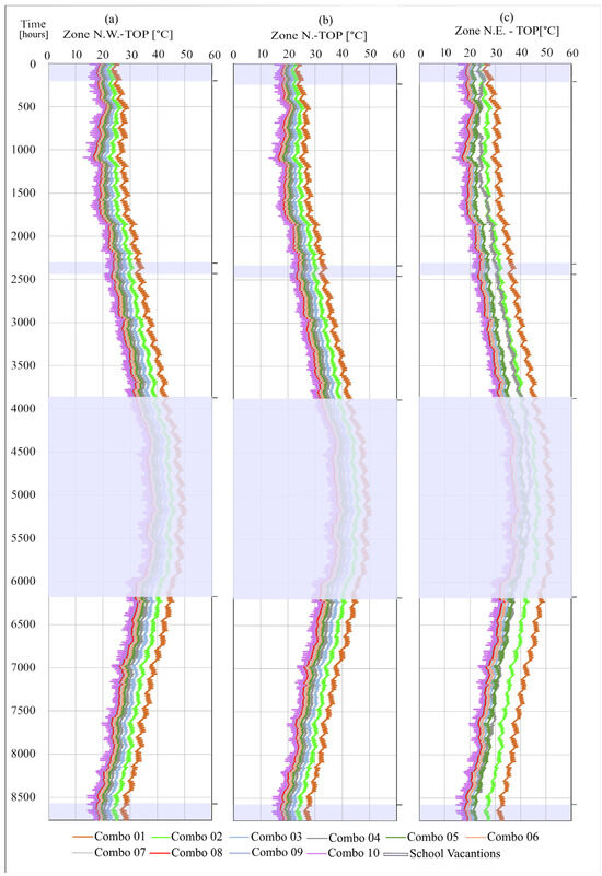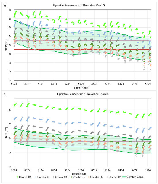 Examining the results presented in Figure 14a,b (for Zone N and Zone S, respectively), it is evident that managing the internal operative temperature within the comfort zone is achievable, primarily by using the ventilation settings Combo 04, 05, and 06.