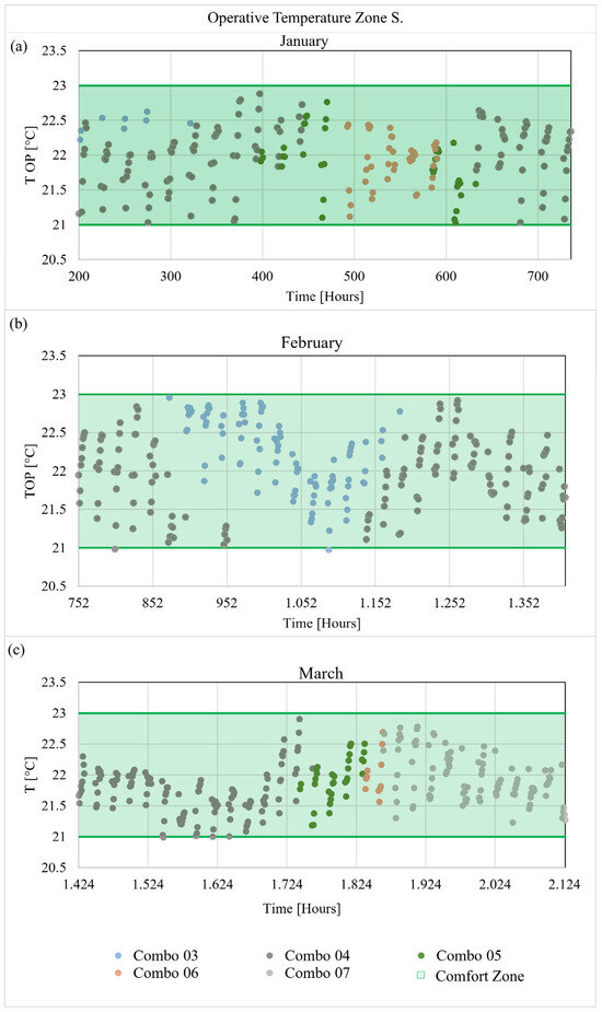Finally, the graph in Figure 6c shows the internal operative temperature in Zone N during March. In this month, the external temperature is higher than in the previous months, requiring more combinations to achieve internal comfort. Specifically, combinations ranging from Combo 03 to Combo 07 are used. Similarly, Figure 7b, which depicts the internal operative temperature trend in Zone S during March, requires the use of combinations from Combo 04 to Combo 07. The dynamic management of air exchanges during these months allows for the internal temperature to remain within the comfort range of 21 °C to 23 °C.