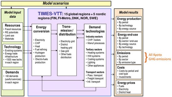 TIMES-VTT model structure showing main inputs, modeled sectors, and model outputs.