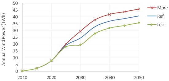 In this study, the reference of comparison for each year includes considerable ‘base case’ wind energy (Figure 2). Using a more modest reference scenario would allow more marginal increases, and a more ambitious reference regarding wind power deployment would have a very small impact on the marginal increase in wind energy.