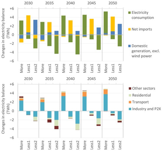 The results for the electricity sector in Finland are shown in Figure 3 for the reference scenario and the ‘More’ (+5 TWh/a) and ‘Less’ (−5 TWh/a) wind scenarios. The studied change corresponds to approximately 5% of the Finnish electricity demand and, thus, has a relatively small impact when considering the overall electricity supply. A marginal addition of wind power leads to marginal changes in the overall investments. The impacts of modeled wind power scenarios can be observed more clearly when only the changes are drawn (Figure 4).