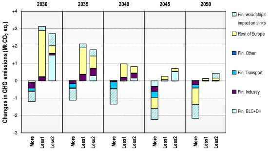 Figure 5 separately shows the GHG impact for Finland (Fin-Direct) and the rest of Europe (RoEur). On top of these model results, we added an estimate of the impact of wood chips on the carbon sinks. This is a rough estimate calculating a ‘penalty’ for comparing two situations: either wood chips are burned and release their carbon content directly or the source wood is left in forests, where small-diameter stem wood continues to grow and branches and stumps decay. Liski et al. estimated a range of 20–109 gCO2eq/MJ for this emission impact in Finland [31]. The range was due to differences in forest chip source wood, geographical location, and the studied emissions’ time frame. We used an average factor of 55 gCO2eq/MJ as the TIMES model results do not provide sufficient detail in terms of different types of forest chips or the location of the source wood within the country.