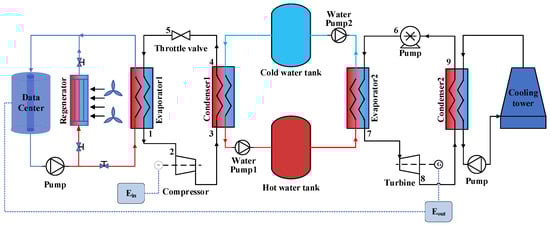 Considering that the layouts of the system are similar, here, the layout is described by taking the subcritical HP and ORC as an example, as shown in Figure 1. It can be found that the Carnot battery consists of an HP, a thermal storage loop, and an ORC. During the charging process, the HP operates as follows: initially, the working fluid passes through Evaporator1 to absorb heat from the coolant of the liquid-cooled DC (5→2) and then flows into the Compressor to further increase the pressure and temperature (2→3). Thereafter, the fluid undergoes heat exchange with pressurized water in the Cold water tank within Condenser1 (3→4). Finally, the fluid enters the Throttle valve for further cooling and pressure reduction (4→5) before returning to Evaporator1 to complete the cycle. In the meantime, the cold water absorbs the condensation heat from the HP to become the hot water in the thermal storage loop. During the discharging process, the ORC working fluid absorbs the stored thermal energy in Evaporator2 (6→7) and then flows into the Turbine to expand and output electricity (7→8). The expanded fluid then enters Condenser2 for further cooling (8→9). Finally, the fluid is pressured by the Pump and completes the cycle (9→6). When the Carnot battery is inactive, waste heat from the DC’s liquid cooling loop is dissipated to the environment via an air-cooled Regenerator, ensuring stable thermal management.