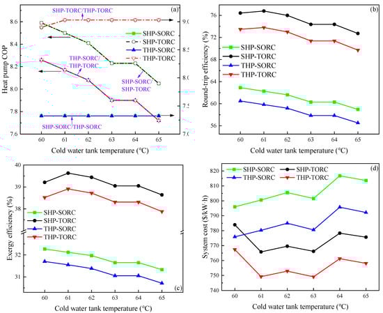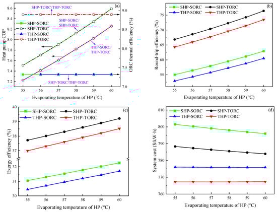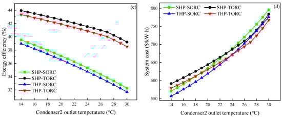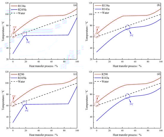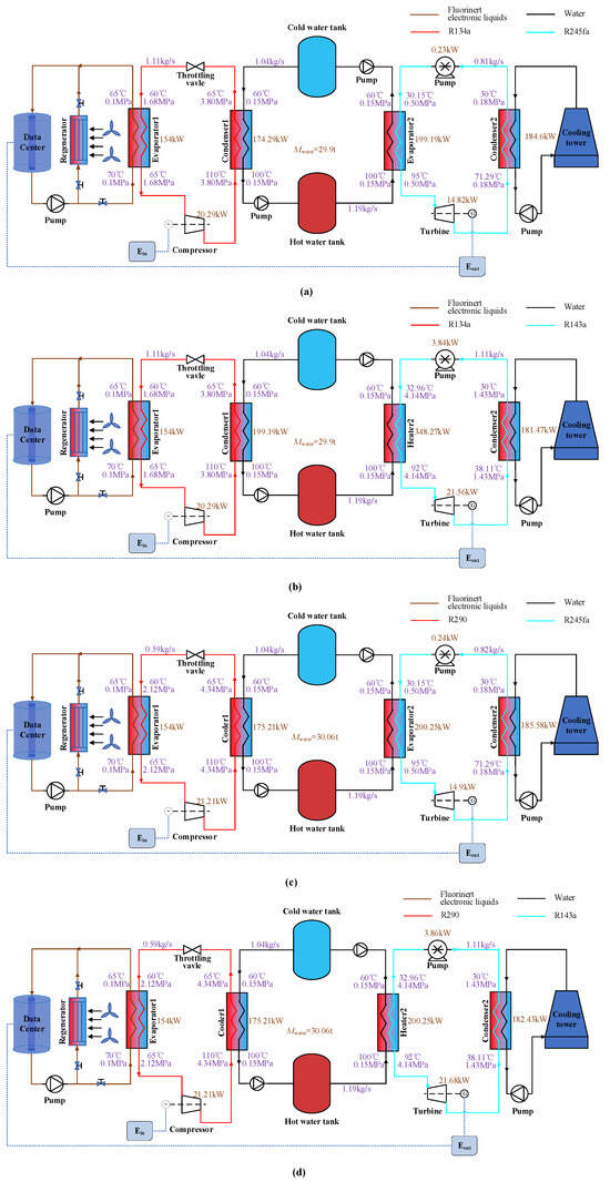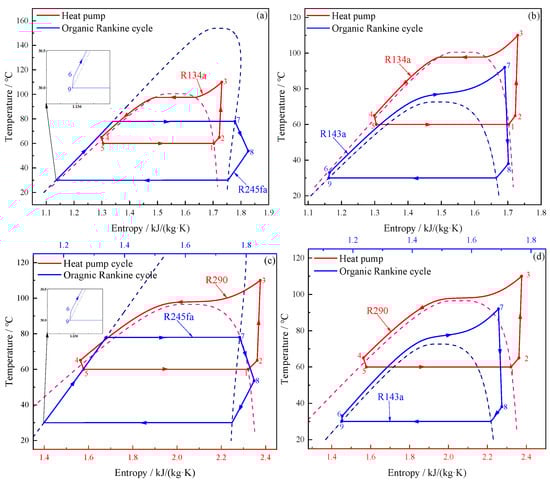 For the four considered systems, the corresponding T- diagrams are provided in Figure 2. It can be found that when the working fluid has a higher critical temperature, the system operates in the subcritical region. This means that the HP fluid is condensed by cold water, and the ORC fluid is evaporated by hot water. Due to the fact that the temperature keeps constant in the process of phase change, the pinch points of the HP condensation and ORC evaporation are usually located at the bubble or dew point, as shown in Figure 2a. As a comparison, when the working fluid has a lower critical temperature, the state of the fluid at the highest temperature will be located at the supercritical region. Under this condition, the HP fluid is cooled by cold water, and the ORC fluid is heated by hot water, as shown in Figure 2d. Since the fluid temperature continuously varies with the heat, there is a better temperature match between working fluid and water.
