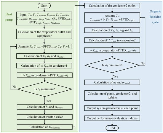 Based on the above established thermo-economic models and design parameters, the MATLAB R2021a platform is used to develop the corresponding model code, and REFPROP 9.0 is employed to calculate the physical properties of the selected working fluids. It should be noted that in order to meet the constraint of the PPTDs, the outlet temperature of Condenser1 or Cooler1 is iterated for HPs, and the outlet temperature of Evaporator2 or Heater2 is iterated for ORCs. Taking SHP-SORC as an example, the calculation flow chart is provided in Figure 3. It can be observed that the chart mainly consists of two sections, corresponding to the calculations of HP and ORC.