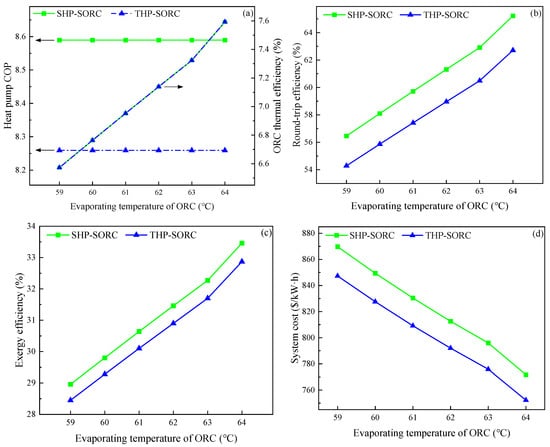 As stated in Section 4.2, this study employs various working fluid combinations for each battery. The sensitivity analysis of the fluids in SHP-SORC is exhibited in Table 8. In SHP-SORC, when R134a is designated as the HP working fluid, its amalgamation with any ORC working fluid yields a superior RTE in comparison to other fluid combinations within the identical ORC working fluid configuration. Thus, R134a is chosen as the HP working fluid. The system demonstrates a maximum RTE of 62.91% when selecting the ORC working fluid R245fa. Moreover, the exergy efficiency also reaches its maximum value of 32.27% under this combination. Therefore, R245fa is selected as the ORC working fluid.
