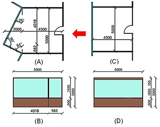 (A) A diagram illustrating an office room plan with multi-angled façade solutions. (B) A façade system designed with multi-angled façade. (C) An office room layout featuring a flat façade. (D) A design representation of a flat façade.