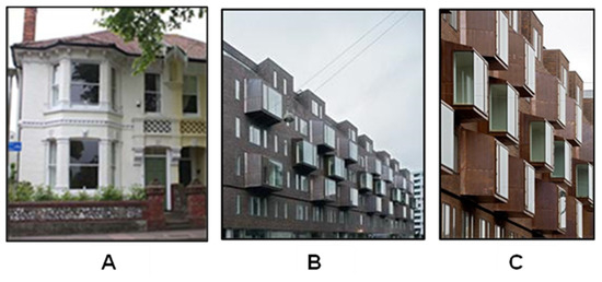 (A) Bay windows used in the late Victorian and Edwardian eras. (B,C) Contemporary buildings in Denmark incorporating façade extensions. Photo source: (A): Freepedia [17]. (B,C) EUmies awards [16].
