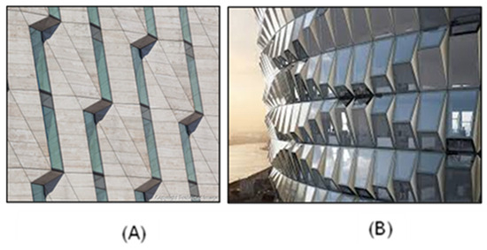 (A) The façade of Horten Headquarters, designed by 3XN in Hellerup, Denmark. (B) The Schüco Parametric System, featuring a geometrically freeform 3D façade design. Photo source: (A) 3XN website: https://3xn.com (accessed on 12 March 2022); (B) https://www.schueco.com (accessed on 20 April 2021).