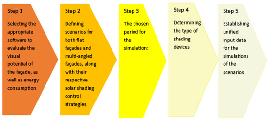 This section outlines several key steps, including selecting the appropriate software to evaluate both the visual potential of the façade and energy consumption. Additionally, it involves defining scenarios for both flat and multi-angled façades, determining the type of shading devices, and establishing unified input data for the simulations, as illustrated in Figure 6 below.