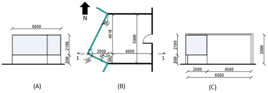 Figure 1 illustrates an office room plan incorporating solutions for multi-angled façades (Figure 1A), highlighting the distinction between this concept and traditional flat façades with conventional dynamic shading systems (Figure 1C). Simulations will be conducted for both façade types to evaluate their potential.