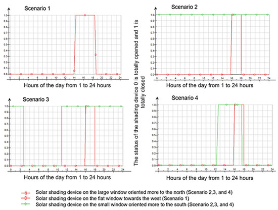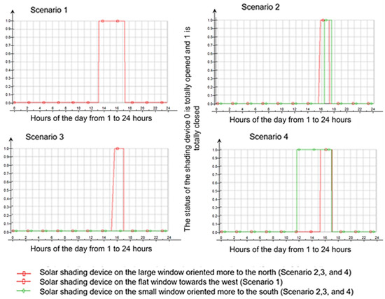 The yearly area-weighted energy consumption for mechanical ventilation is higher by 22% in Scenario 1 compared to that consumed in Scenario 2 (see Table 4). Looking at Figure 8, it can be seen that, in July, the solar shading device in Scenario 1 is closed between 14:00 and 18:30, while in Scenario 2 the shading device on the small window oriented more to the south is totally closed for the whole day (see Figure 8), thereby preventing solar radiation from penetrating inside the room and reducing the consumed energy for mechanical ventilation. The shading device on the large window oriented more to the north is closed between 16:00 and 18:00 (see Figure 8), which is almost half the period in Scenario 1. This provides good visual quality and, at the same time, the solar radiation penetrating inside the room is still lower in Scenario 2 compared with Scenario 1 (see Table 7).