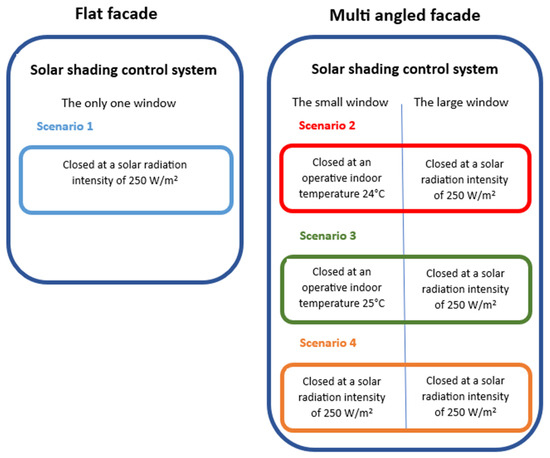 The discussion is carried out mostly in two main groups, the first group is a comparison between Scenarios 1 and 2, which have different façade configurations (a flat façade and a multi-angled façade) and the second group is between Scenarios 2, 3, and 4, which have different shading control systems (see a visual presentation of the four scenarios in Figure 12 below).
