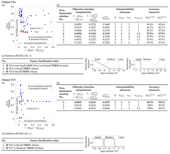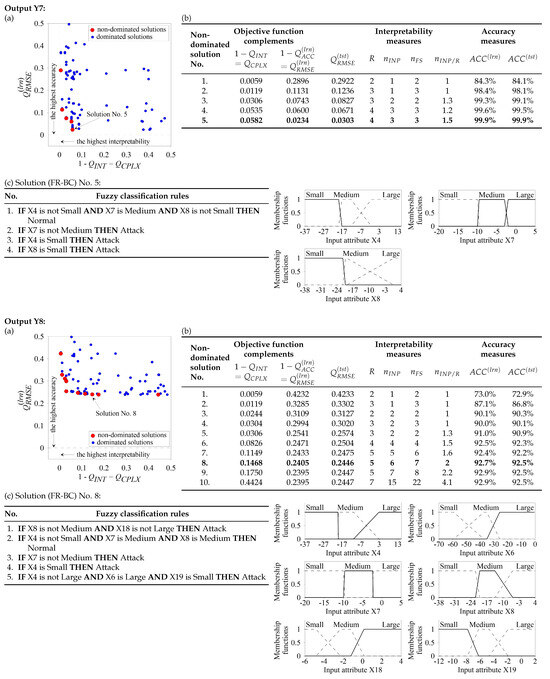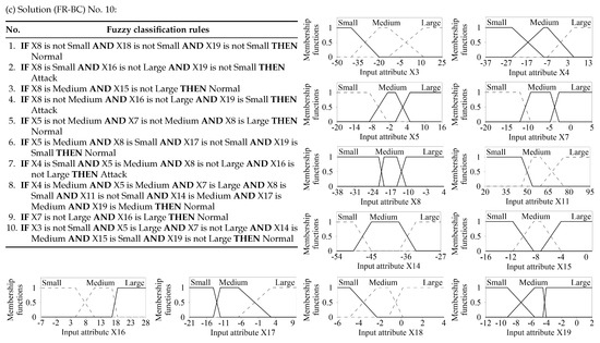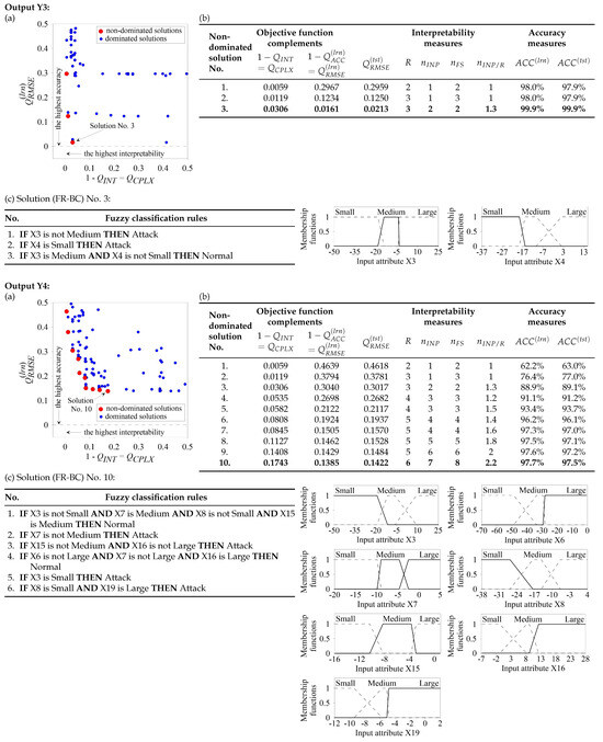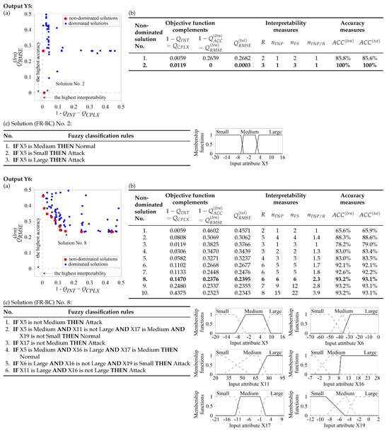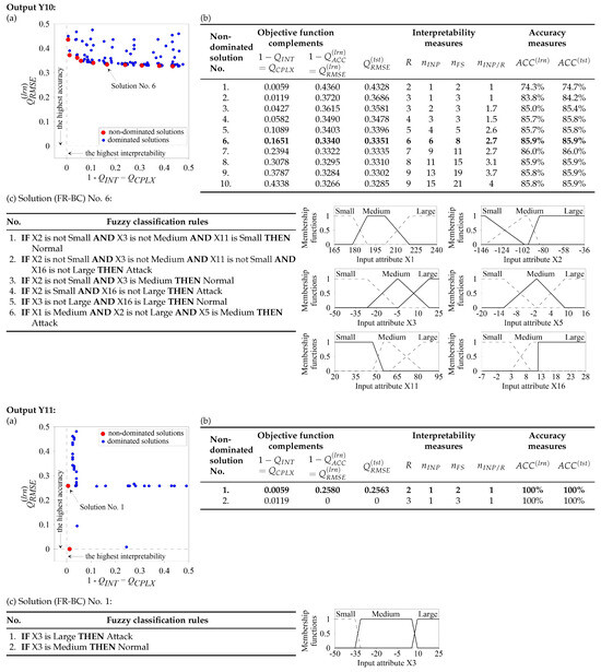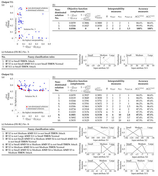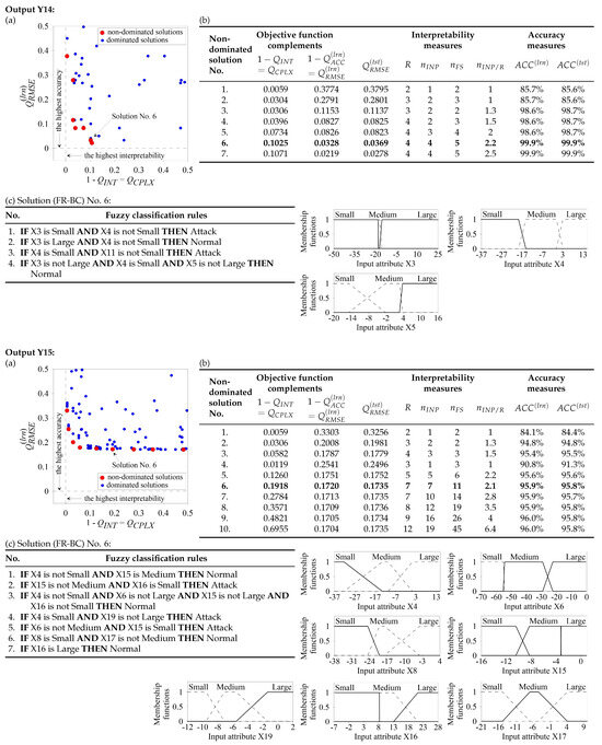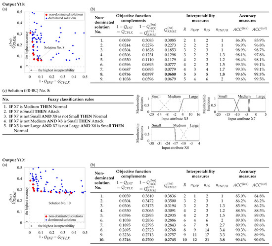 As we already mentioned in the introduction of this paper, the recently published data sets used in our experiments are available at https://github.com/wsyCUHK/WSYCUHK_FDIA; they are also discussed in [2]. They include the data for the IEEE 14-bus system and for the IEEE 118-bus system. First, we report the results of our experiments carried out using the IEEE 14-bus system data. These data are collected in five data sets referred to as data14_1.mat, data14_2.mat, data14_3.mat, data14_4.mat, and data14_5.mat. Each of these data sets contains 100.000 learning data records and 10.000 test data records. In turn, each data record contains 19 numerical input attributes and 19 corresponding output attributes (class labels) assigning either “Normal” or “Attack” class labels to a given record. 19 input attributes represent measurements coming from 19 meters (their placement in the structure of the IEEE 14-bus system is shown in Figure 1). Our goal is to design a collection of 19 independent FR-BCs indicating, in a transparent and accurate way whether, in a given measurement point, we deal with FDIA (class label “Attack”) or with normal operation of the smart grid (class label “Normal”). In such a way, we combine the FDIA’s detection and localization tasks. Now, we concentrate on the data14_1.mat data set—see Table 1 for some details of particular records of that data set. Since output attribute Y9, corresponding to the X9 measurement point, is characterized only by “Normal”-class data, we are unable to design an FR-BC for that point. Thus, we design 18 independent FR-BCs for the remaining measurement points. For each of those FR-BCs—corresponding to particular output attributes , —the results of SPEA3-M-OEOA-based genetic learning and optimization experiments are presented in detail in Figure 2. The original learning and test data sets containing 100.000 and 10.000 data records, respectively, are used in those experiments. Parts (a) of Figure 2 present families of dominated and non-dominated solutions (FR-BCs) generated by our SPEA3 method. A family of non-dominated solutions represents the best available Pareto-front approximation (used in further considerations) for a given output. Such a family of non-dominated solutions begins with solution No. 1 of highest interpretability and lowest accuracy and ends with the solution of lowest interpretability and highest accuracy (it is solution No. 3 for Y1, solution No. 10 for Y2, solution No. 3 for Y3, etc.). Numerical details of interpretability and accuracy measures of particular non-dominated solutions from a given part (a) of Figure 2 are collected in the corresponding part (b), in which is the number of input attributes per rule, and are the percentages of correct decisions in the learning and test data sets, respectively (the remaining parameters were defined in previous section of this paper). Particular non-dominated solutions from parts (a) and the corresponding parts (b) of Figure 2 are characterized by different levels of optimized accuracy–interpretability trade-off. The user can select—for a given output—a single solution (a specific FR-BC) that is characterized by a desired level of compromise between accuracy and interpretability. For a given output, a single non-dominated solution of particular interest is the solution characterized by the highest accuracy in the test data set and the highest interpretability, i.e., the solution of highest generalizing capabilities combined with the highest transparency (such a solution is referred to as “the best solution” in Figure 2). Such single solutions—for particular outputs—are marked in parts (a) and denoted by boldface in the corresponding parts (b). In turn, in the corresponding parts (c) of Figure 2, their fuzzy rule bases are presented, including membership functions of fuzzy sets that occur in those rules.