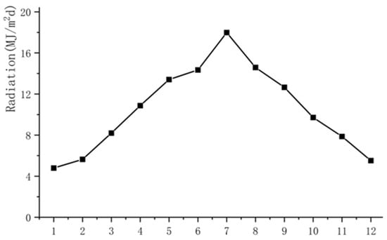 The experimental house is located in Zhuzhou, Hunan, which belongs to the subtropical monsoon climate. Figure 2 shows the annual temperature changes in Zhuzhou over the past five years, and Figure 3 shows the annual solar radiation changes in the area. From the patterns of monthly maximum temperatures and solar radiation intensities, it can be seen that the cooling load in summer is very high, while the heating load in winter is relatively low, with significant differences in solar radiation levels between winter and summer. Therefore, it is necessary to formulate corresponding control strategies for the active shading system according to different seasons. Due to the short duration of the transitional seasons in the area, this paper categorizes different months of the transitional seasons into summer and winter control periods based on their radiation levels to simplify the control strategies of the louvers.