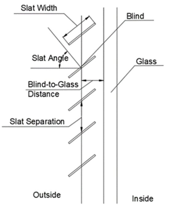 The parameter selection followed an empirically validated protocol derived from preliminary studies and engineering practices, ensuring representative sampling within conventional ranges: slat angles spanned 30–150°, and blind-to-glass distances varied between 5 cm and 15 cm. This stratified parameterization enabled comprehensive coverage of typical architectural configurations while maintaining experimental validity. Figure 4 shows the slat geometry of the louver parameters in this study.