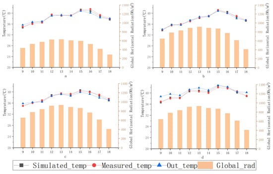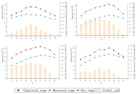 The experimental meteorological data underwent temporal alignment processing in strict accordance with the EnergyPlus EPW file format specifications. Dynamic thermal simulations were executed using EnergyPlus v24.1; the results of the experiment and simulation are shown in Figure 7 and Figure 8, with model validation performed following the ASHRAE Standard 140-2020 [24] testing protocols. Data quality control adhered to the Standard for Human Behavior Data in Building Energy Simulation (T/CABEE 042-2023 [25]). A dual-metric evaluation system was implemented: