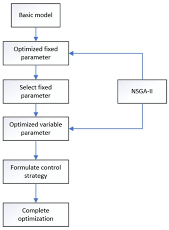 The optimization process adopts a two-stage parametric approach, and the flow chart of its work is shown in Figure 9. Phase I optimizes static louvers using four geometric parameters (width, angle, spacing, and glass distance) to establish Pareto front solutions. Through systematic data processing, optimal fixed parameters are subsequently selected from the phase I Pareto frontier. Phase II integrates selected fixed parameters into the model, optimizing variable parameters (angle and distance) under operational constraints. Finally, the control strategy for dynamic louver operation is formulated by analyzing the variable parameter combinations derived from the second-stage Pareto front solutions. By improving the algorithm, the theoretical maximum population size is greatly reduced, thus decreasing computational complexity. Simultaneously, after completing the fixed parameter optimization, a fixed parameter more aligned with the user’s optimization preferences will be more advantageous in obtaining a solution that satisfies the user’s optimization objectives.