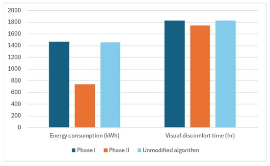 The results demonstrate that optimizing variable parameters in the second phase significantly enhances the overall performance of fixed-parameter louver systems. For instance, in Scenario E, applying Equation (6) with weighting coefficients of 0.4 for building energy consumption and 0.6 for visual discomfort time duration yielded an optimal louver control strategy through the weighted optimization approach. The comparative analysis included processing Pareto front solutions from the unmodified NSGA-II algorithm under identical conditions. Figure 14 presents a tripartite comparison of: (1) post-first-phase optimization, (2) post-second-phase optimization, and (3) results from the unmodified algorithm. The variable parameter optimization achieved substantial performance improvements, reducing building energy consumption by 49% and visual discomfort time by 5%. The values of the variables bound to the three results are shown in Table 7. Notably, the unmodified algorithm’s optimization efficacy remained comparable to Phase I results, demonstrating inferior performance relative to the enhanced algorithm’s final output. This demonstrates that achieving the theoretical Pareto front with the unmodified algorithm requires exponentially increased computational effort (e.g., doubling iteration counts), and the enhanced algorithm attains comparable solutions with markedly improved computational efficiency.