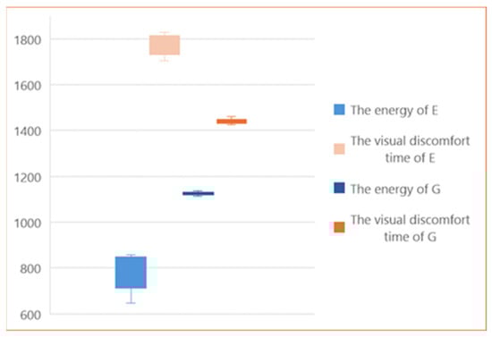 Figure 15 analyzes the distribution of the optimization results of variable parameters with different fixed parameters. The results show that the energy consumption of Scenario E is lower, but the frequency of uncomfortable lighting is higher, while Scenario G is the opposite. This indicates that in the optimization with fixed parameters, through biased selection, the algorithm can better meet the subjective needs of the designer. This demonstrates that the improved algorithm can more accurately meet the optimization requirements of the user.