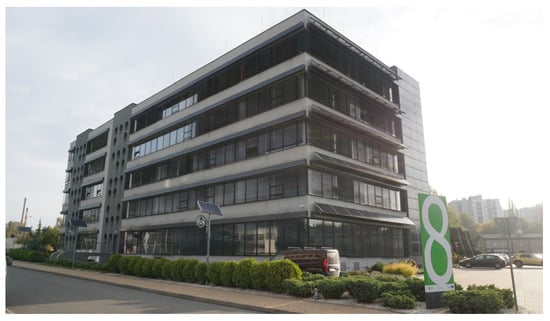 The research was conducted in a passive office building (Figure 1). This object is located in Katowice in south Poland and it was presented in [,]. It has a total and usable area of 8100 m2 and 7500 m2, respectively. Energy-efficient solutions were used in this object, such as triple-glazed external windows with external blinds, photovoltaic modules mounted on the roof and on the facade, and the three trackers in front of the building. Heating and cooling are provided mainly by a thermally activated building system (TABS) in the form of concrete ceiling heating and cooling and additional floor heating in the basement. It is supplied by a set of three cascade-connected two-compressor heat pumps. For energy monitoring purposes, the building management system (BMS) is used.