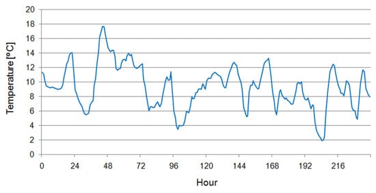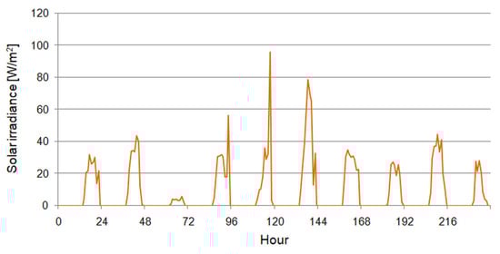 The measurements started on 31 October at 18:00 and ended on 10 November at 18:00. During this period, the outdoor air temperature (Figure 3) varied from 1.9°C (at 7:00 on 9 November) to 17.7°C (at 15:00 on 2 November). The weather was cloudy, and solar irradiance was low (Figure 4). When considering the external, west-facing wall with a window, it was up to 97 W/m2 (at 16:00 on 5 November).