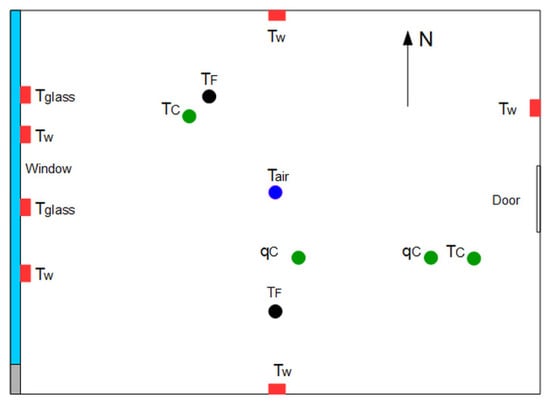 The measurement system was set from various sensors (Table 1). Platinum resistance sensors were used to measure the temperatures of internal and ambient air and the internal surfaces of all vertical walls, windows, ceilings, and floors. Global solar irradiance incident on the external wall was measured by the pyranometer. In the centre of the room, a tripod was placed with three cylindrical air temperature sensors (diameter 3 mm) at heights of 0.55 m, 1.5 m, and 2.2 m above the floor level. All sensors were connected to the Fluke 2638A data logger. Their locations are shown in Figure 5.