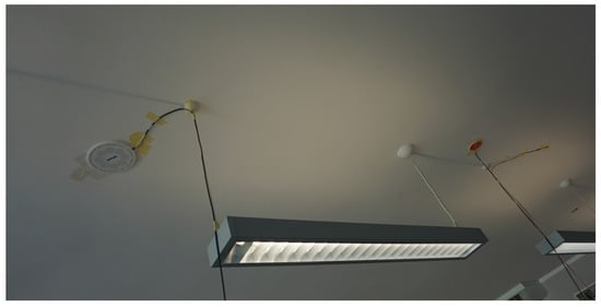 The ceiling heat flux was measured (Figure 6) by the HFP03 (white, on the left) and HFP01 (red coloured, on the right) heat flux sensors. This first sensor is an ultra-sensitive heat flux sensor. The manufacturer states that its nominal sensitivity is 500 μV/(W/m2). It was chosen due to low expected values of ceiling heat flux. The second heat flux sensor, HFP01, has a ten-times-lower nominal sensitivity. It had also one important role. Due to its dimensions, HFP03 is larger and heavier than HFP01. Consequently, even if adhesive tape is used according to the manufacturer’s instructions, it may dry and peel off from the ceiling more easily during measurement than the much lighter HFP01. By comparing the results from both sensors, one can easily capture such situations.