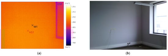 View of the southwest side of the room: (a) thermal imaging photo; (b) real view.