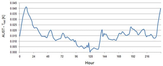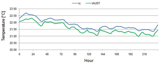 The difference between them (Figure 9) was from 0.10°C (at 15:00 on 2 November) to 0.42°C (at 6:00 on 1 November) with 0.30°C on average. It was very low, which means uniform thermal conditions in the room. In the next step, the area-weighted radiant temperature was calculated. Its comparison with AUST resulted in very small differences, with a maximum of 0.041 K (Figure 10), which can be treated as negligible.
