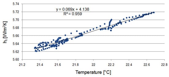 RHTCs were calculated from the simplified relationship (Equation (10)) at the average temperature tmn = 21.7 °C and emissivity ε = 0.95, hr = 5.523 W/m2K, which is very close to the obtained average value of 5.661 W/m2K.