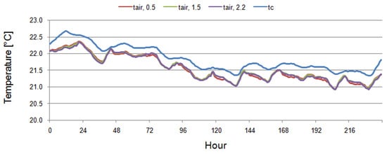 During the measurements, indoor air temperature showed very good vertical uniformity. It varied from 20.93°C to 22.37°C, from 20.92°C to 22.35°C, and from 20.92°C to 22.36°C at heights of 0.55 m, 1.5 m, and 2.2 m above the floor (Figure 13) with the hourly difference between the maximum and minimum values ranging from 0 to 0.08 K. Its average value was from 20.92°C (at 9:00 on 9 November) to 22.35°C (at 16:00 on 1 November) and was lower than the ceiling surface temperature from 0.04°C (at 15:00 on 2 November) to 0.47°C (at 8:00 on 9 November). This temperature difference was then of a similar order as the difference between the ceiling and AUST, which created comfortable indoor conditions.
