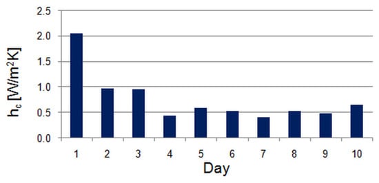 Calculations showed that CHTCs varied from 0.01 W/m2K (at 11:00 on 4 November) to 2.51 W/m2K (at 21:00 on 31 October) with the average value being0.801 W/m2K. But, when excluding the first day of measurements which may have been influenced by various factors (equipment assembling, personal control, etc.), the average hc = 0.639 W/m2K. Its daily averaged values are given in Figure 14.